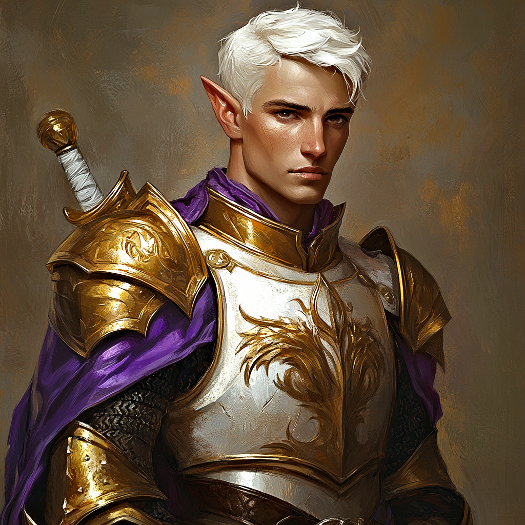 colors of Ausura. His ceremonial cape, split purple and white, flows