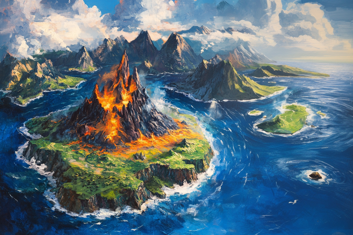 Kaihanga, crowned by the active volcano Mount Taimana, stands as the largest island in the chain. The Kaianga people, seafaring humans who have inhabited the island for countless generations, share the coastal regions with several maero strongholds. These fierce giants conduct their famous Riptide Combat tournaments in the deep waters off the island's eastern shores, where underwater currents are particularly treacherous. The island's interior valleys, perpetually shrouded in mist, harbor centuries-old patupaiarehe settlements, their pale forms glimpsed only during twilight hours when they emerge to perform their haunting flute music.